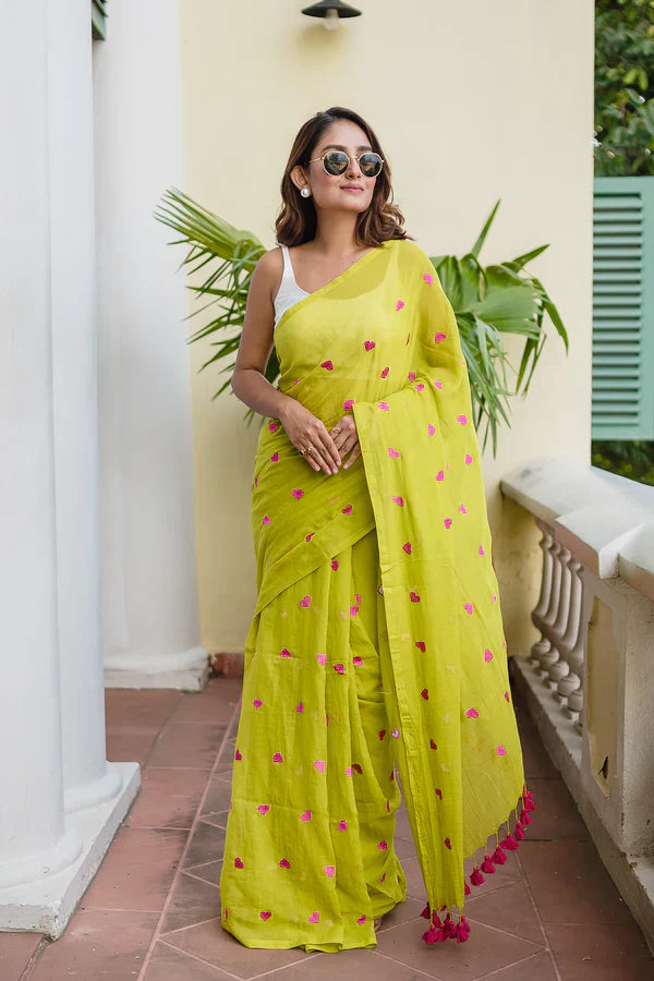 • Load image into Gallery viewer, Lime Green Love Mulmul Cotton Saree
